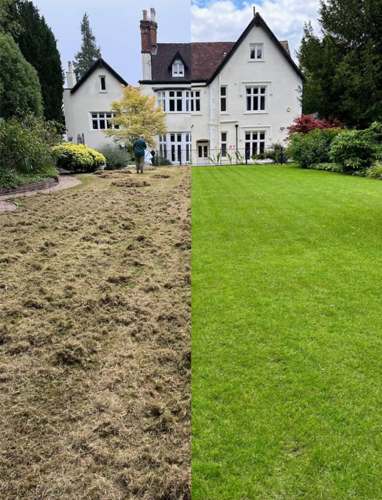 Professional lawn renovation treatments typically include removing moss and heavy thatch build-up, deep scarification to clear dead material, lawn aeration to relieve soil compaction, overseeding with high-quality grass seed, and specialist lawn feeding to support recovery. Together, these processes improve soil structure, encourage stronger root development, and create the ideal conditions for new, healthy, and resilient grass growth.